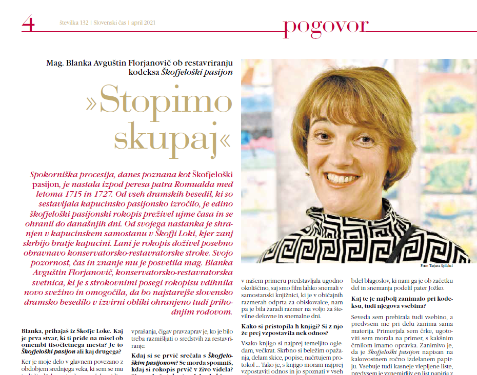 V aprilski številki Slovenskega časa (št. 132, april 2021), prilogi časopisa Družina, je po naslovom Stopimo skupaj objavljen pogovor z mag. Blanko Avguštin Florjanovič iz Škofje Loke, konservatorsko-restavratorsko svetnico, zaposleno v Arhivu Republike Slovenije v Ljubljani, ki je v letu 2020 restavrirala škofjeloški pasijonski rokopis, izvirno knjigo z dramskim besedilom spokorniške procesije, ki jo poznamo pod imenom Škofjeloški pasijon.