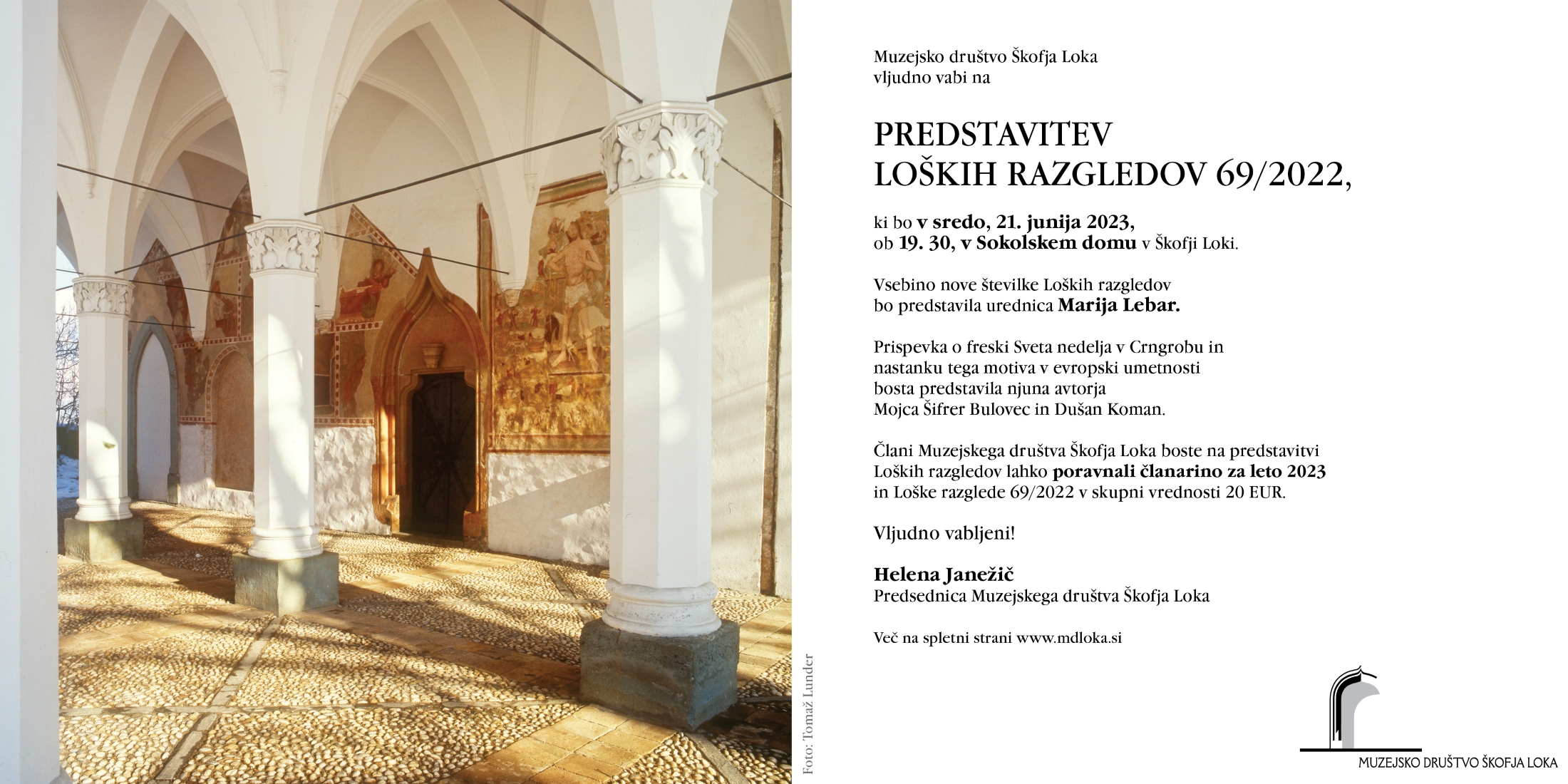 Loški razgledi so osrednji domoznanski zbornik na širšem loškem območju, ki ga že skoraj sedemdeset let pripravlja in izdaja Muzejsko društvo Škofja Loka. Skozi pestre prispevke letošnje številke se bomo sprehodili z urednico zbornika Marijo Lebar, dva avtorja pa bosta svoja prispevka, povezana s fresko Svete nedelje s cerkve Marijinega oznanjenja v Crngrobu predstavila sama. Dr. Dušan Koman bo spregovoril o Ikonografskem motivu Svete nedelje v evropski umetnosti in okoliščinah njegovega nastanka, Mojca Šifrer Bulovec pa bo predstavila Posvetne prizore na freski Svete nedelje v Crngrobu. Vabilo je v prilogi.