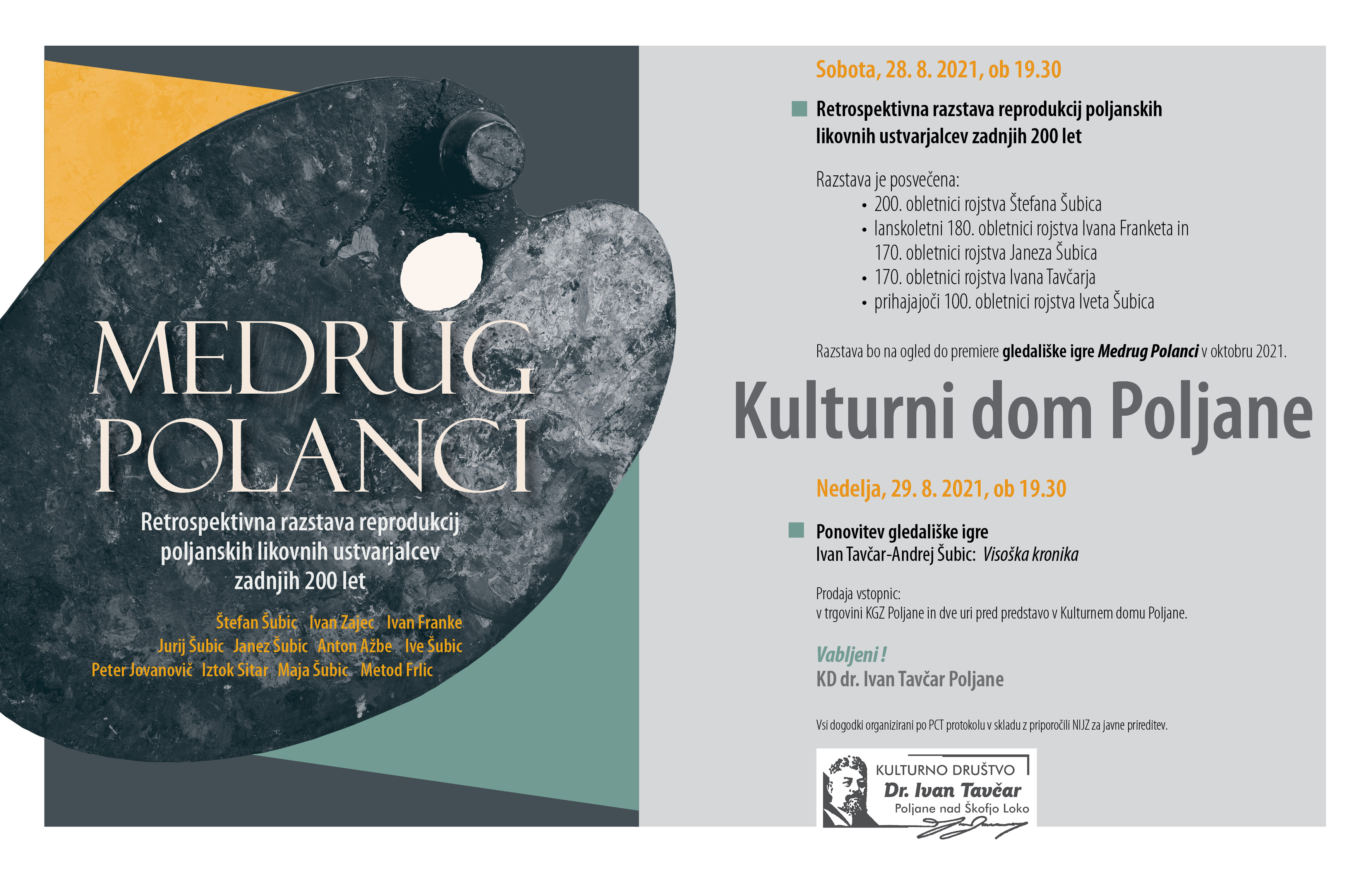 - v soboto, 28. avgusta 2021, ob 19.30: otvoritev retrospektivne razstave reprodukcij poljanskih likovnih ustvarjalcev zadnjih 200 let; in